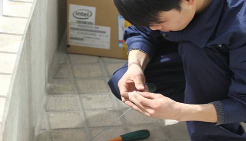 008(5)纱盒底端钻孔,左手张紧纱网以防缠绕进电钻转盘;
